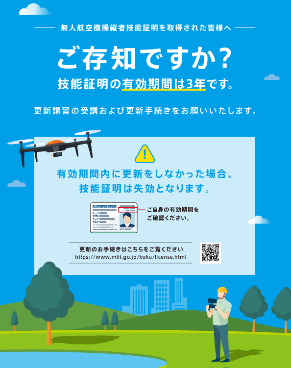 ●更新には、身体適性に関する基準を満たし、かつ、「無人航空機更新講習」の修了が必要。(航空法第132条の51第3項)