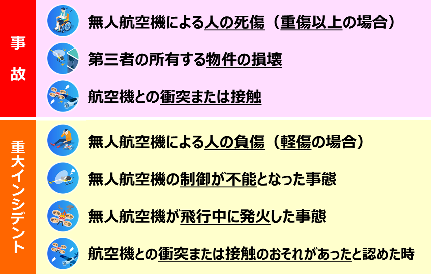考えたくはありませんが、ドローンを飛行させている以上、事故を起こしてしまう可能性はゼロではありません。もしもドローンに関する事故又は重大インシデントを発生させてしまった場合、ただちに飛行を中止し負傷者を救護すると共に、当該事故又は重大インシデントが発生した日時及び場所などを国土交通大臣に報告しなければなりません。これら通報もDIPS2.0にて行います。