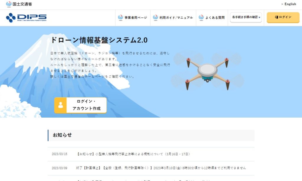 フライトに必要な登録や申請の詳細を確認する前に、ドローンの航空法に関する申請を行う「ドローン情報基盤システム2.0(以下、DIPS.2.0)」の準備を進めておきましょう。