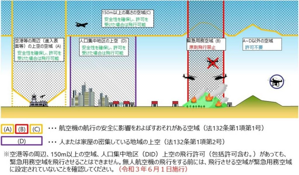 これらの空域・方法での飛行に1つでも該当する場合には、たとえご自身の所有する土地での飛行であったとしても航空法の規制対象となり、申請が必要です。なお、緊急用務空域は災害などが発生した際に臨時的に設定されるもので、設定されている間は一般のドローンは緊急用務空域を飛行させることはできません。