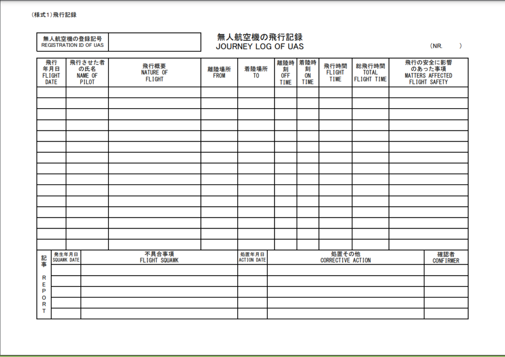 ※飛行日誌を備えない、飛行日誌に記載すべき事項を記載しない、虚偽の記載を行った、携行していない、といった場合は10万円以下の罰金が科せられますので、ご注意ください。