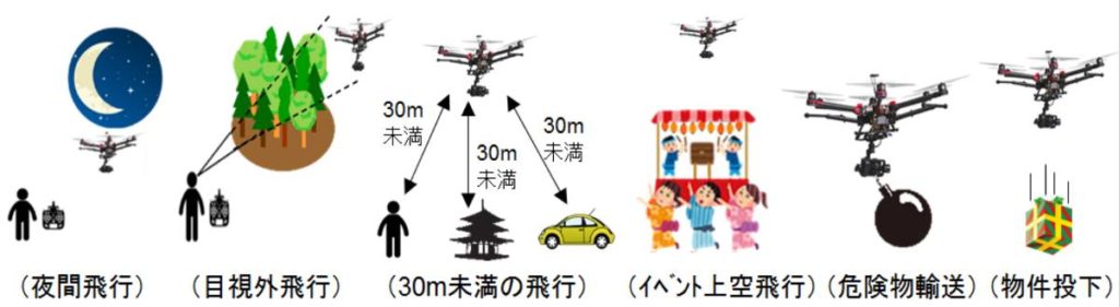 特定飛行とは、航空法の規制対象となる無人航空機の飛行のことで、具体的には以下の4つの空域と6つの方法での飛行を指します。