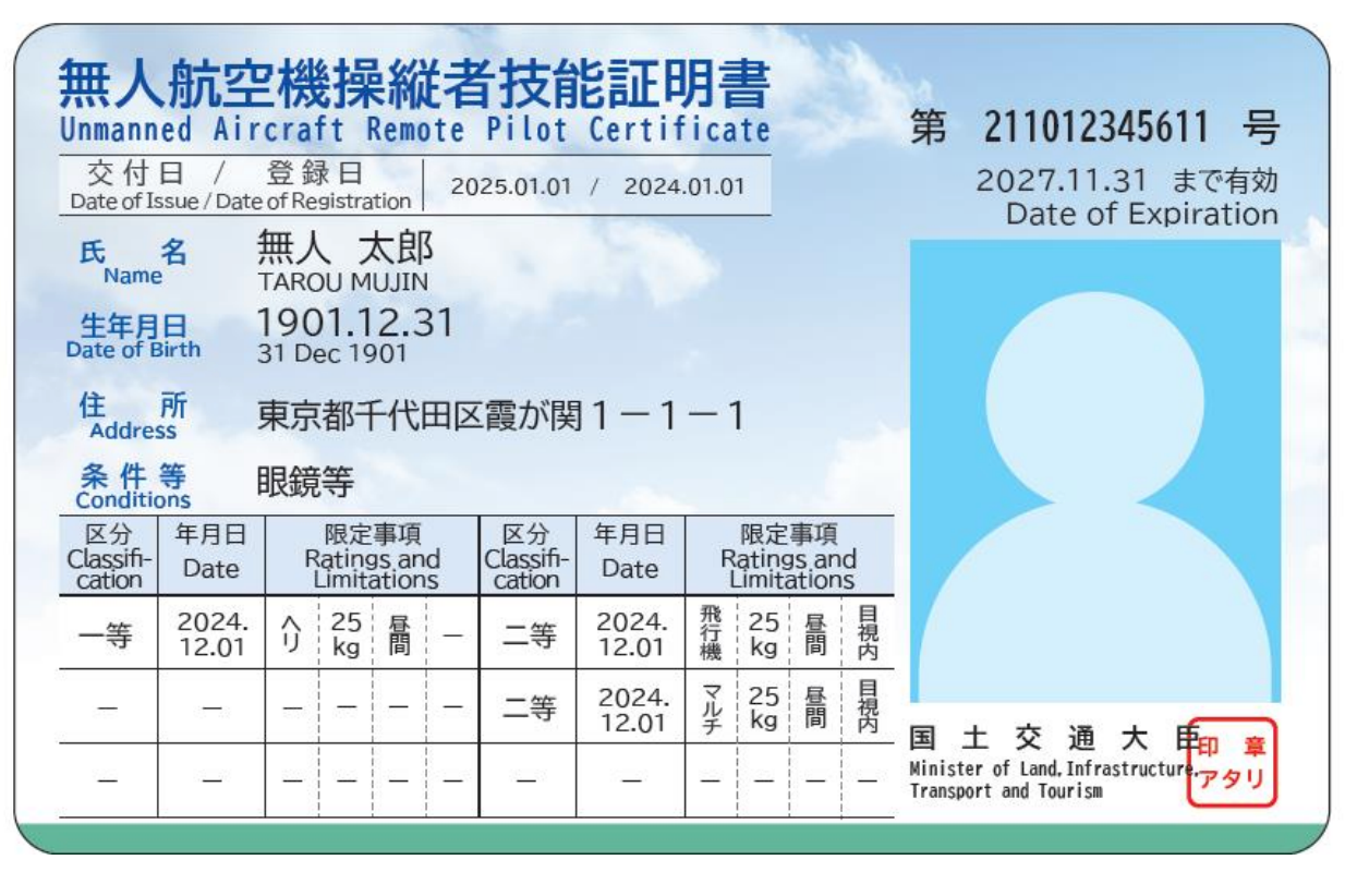 「無人航空機操縦者技能証明書の取得」は、登録講習機関の一般社団法人 南九州ドローン操縦士協会の講習だけでは完了しません。「指定試験機関」での試験(身体検査・学科試験)に合格することが必要となります。 各試験の料金や内容、試験の申込方法、技能証明書発行までの流れについては、指定試験機関「一般財団法人 日本海事協会」のサイトをご覧ください。